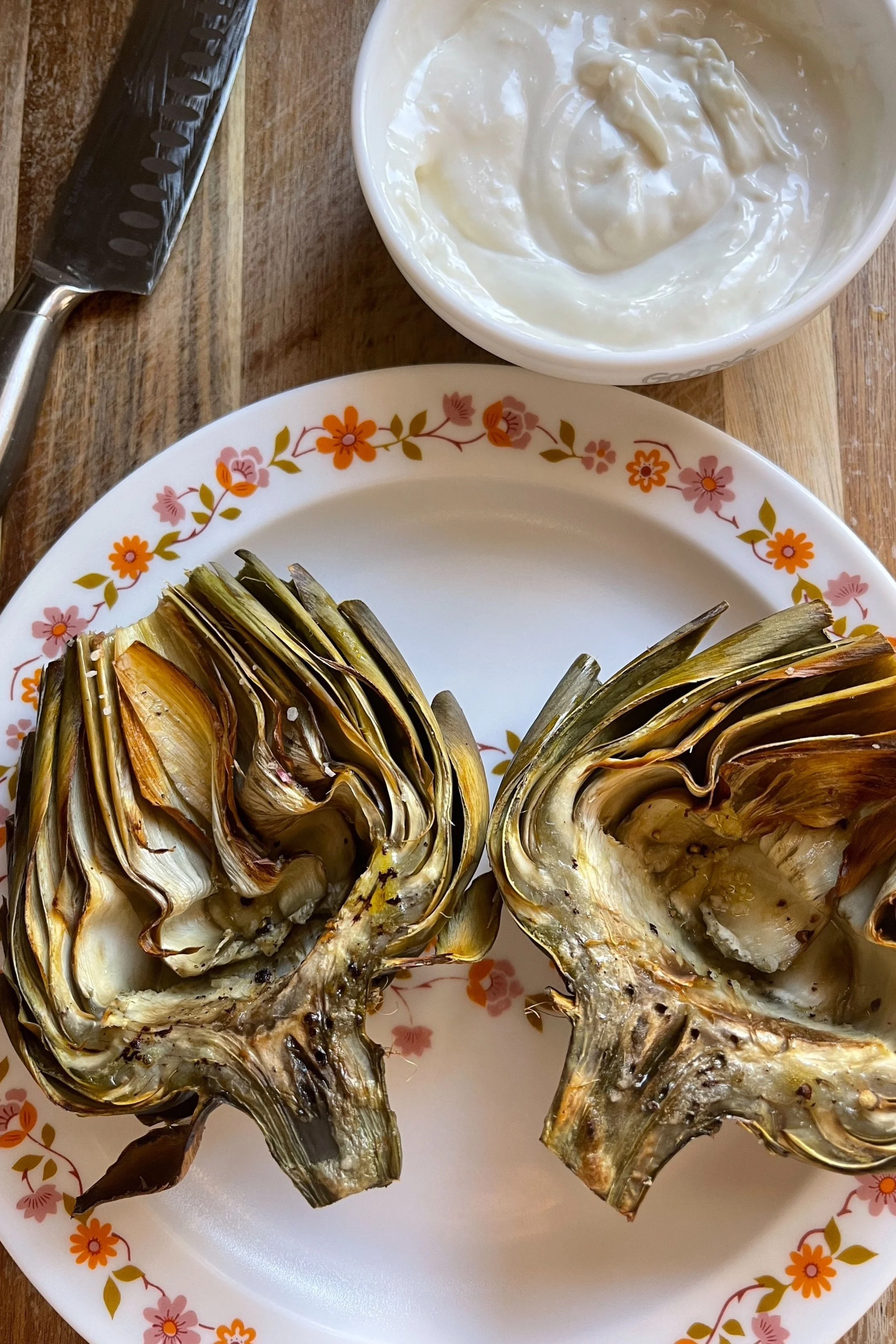 Oven roasted or grilled artichoke w/ a homemade garlic aioli