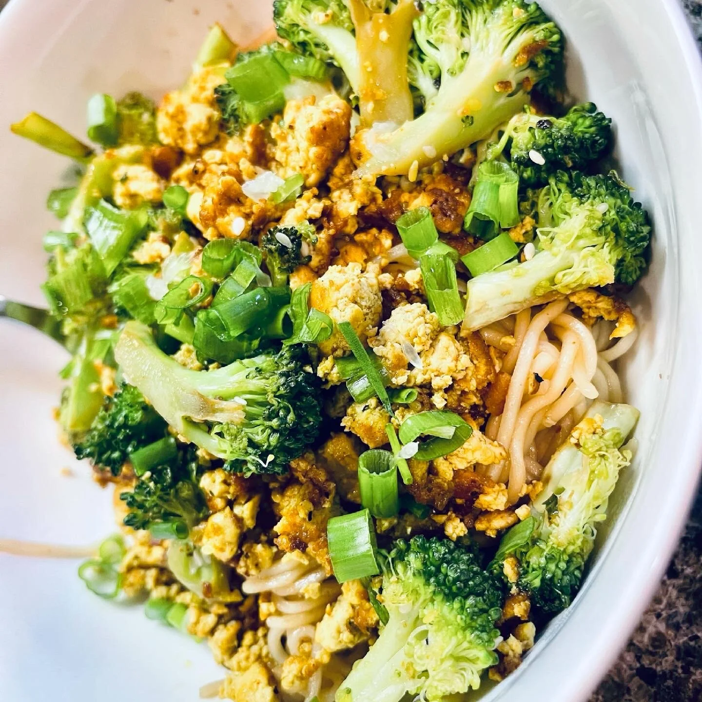 Add noodles into pan, toss to coat, lower heat to medium, add another drizzle of sesame oil, add in cooked tofu and broccoli, and finishing sauce